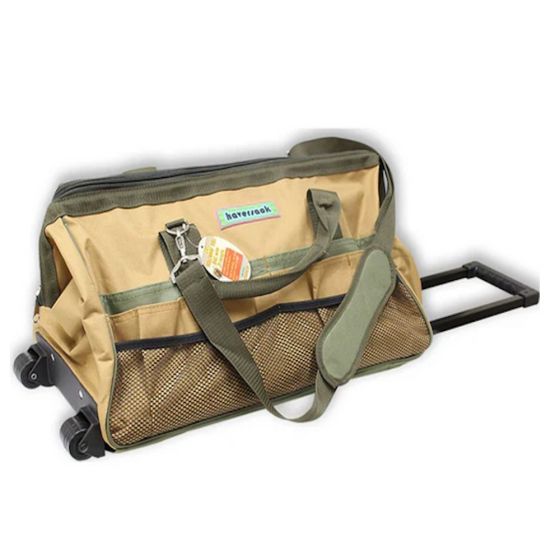This 24 Inch Rolling Storage Bag with 21 Pockets is a large, roomy tool bag with many pockets to hold all your tools and accessories. The 24 Inch Rolling Storage Bag with 21 Pockets has wheels on the end, and a expandable/retractable handle to you can just wheel it along behind you. This24 Inch Rolling Storage Bag with 21 Pockets has 16 outside pockets, including 3 mesh pockets, and 4 inside pockets. It has a rigid, reinforced bottom, and is soft sided to hold everything you need.