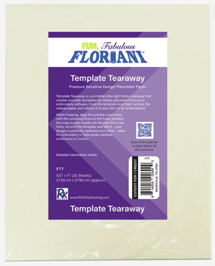 Floriani Template Tearaway Design Placement Paper gives you the visual help you need to make your hooping experience much easier. With Floriani Template Tearaway Design Placement Paper your designs are placed in the appopriate position everytime. Placing of an embroidery design in a bordered area such as a quilt square or pocket is easy with Floriani Template Tearaway Design Placement Paper. The 8.5" x 11" Floriani Template Tearaway Design Placement Paper are ready to print and work on almost all types of printers and copiers. Floriani Template Tearaway Design Placement Paper works in just three easy steps; use your favorite embroidery software to print out a template of your design, peel back the protective paper and stick the Floriani Template Tearaway Design Placement Paper to the fabric or garment for an accurate hooping guide. Use Floriani Template Tearaway Design Placement Paper to combine intricate patterns for borders or large multi-hoop designs,accuracy doesn’t get any easier. 25 sheets total.