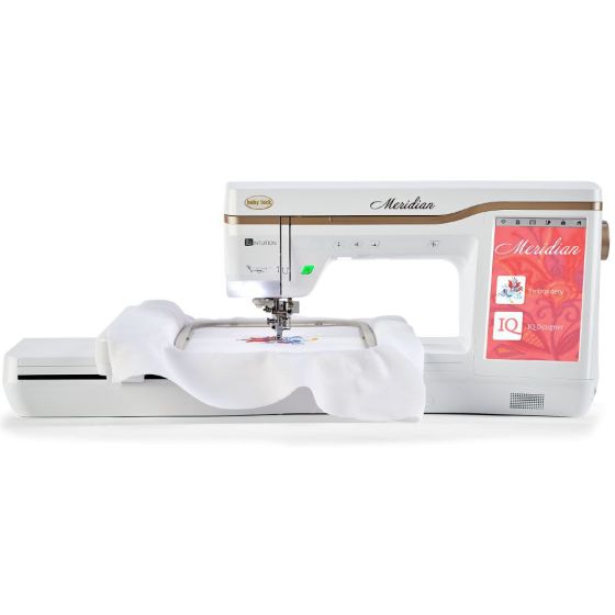 Raise the bar for what’s possible with your embroidery projects with the Baby Lock Meridian embroidery machine. The Baby Lock Meridian Embroidery Machine makes embroidery easier than ever thanks to IQ Technology™ that allows you to wirelessly transfer images to your machine from your smart device using the IQ Intuition™ Positioning App for perfect design placement in the hoop or design creation in IQ™ Designer.