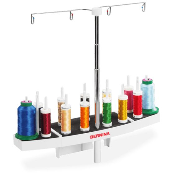 The Multiple-spool Holder can be mounted almost effortlessly on a wide range of sewing machines, and can also be switched between two machines with the greatest of ease. The holder has room for up to 15 spools, enabling quick access to threads of different colors. If need be, removing individual spool pins from the Multiple-spool Holder creates room for larger spools as well as thread cones, enabling you to execute your sewing, embroidery and quilting projects more efficiently.
