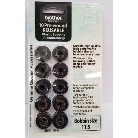 Brother PWB250B Black Pre-Wound Bobbins are a genuine Brother accessory. Brother PWB250B Black Pre-Wound Bobbins come in a pack of ten reuseable bobbins. 60 weight thread