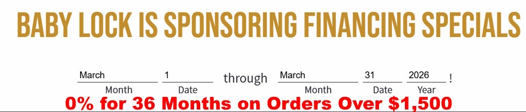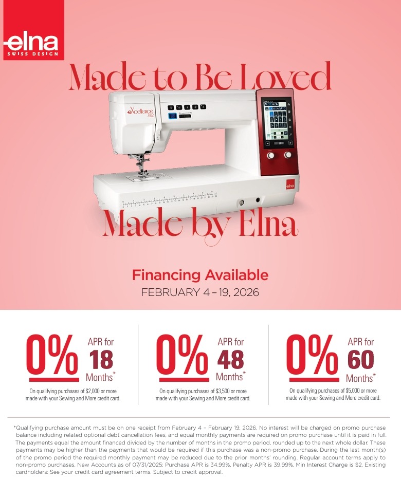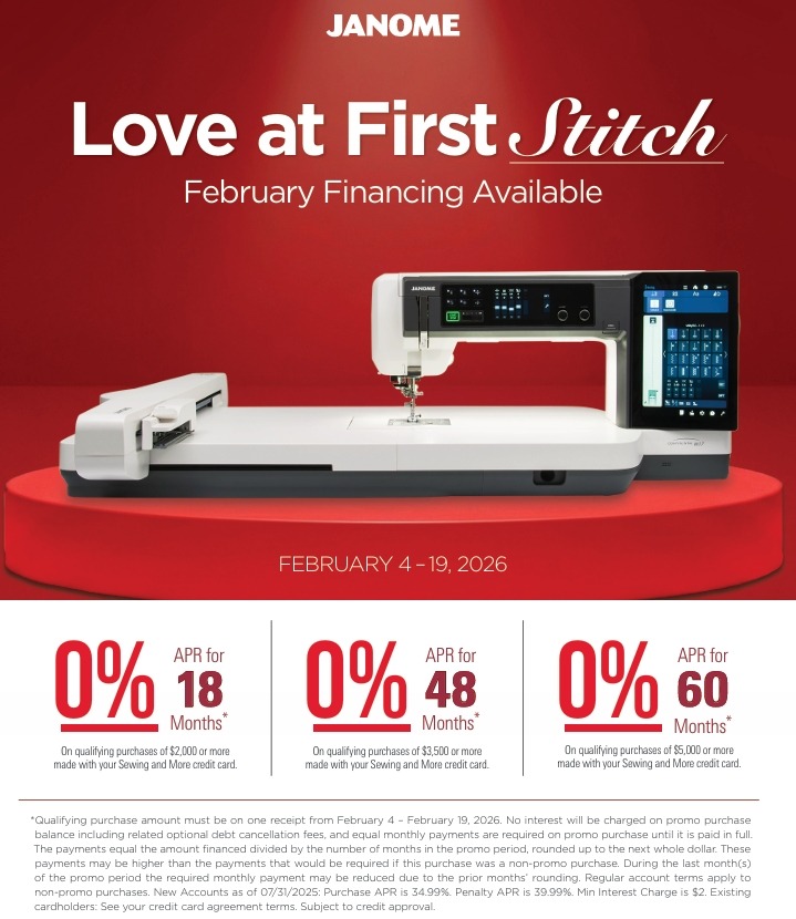 On qualifying purchases of $150 to $1,999.99 made with your Sewing & More credit card. Interest will be charged to your account from the purchase date if the promotional balance is not paid in full within 6 months. Minimum monthly payments required.