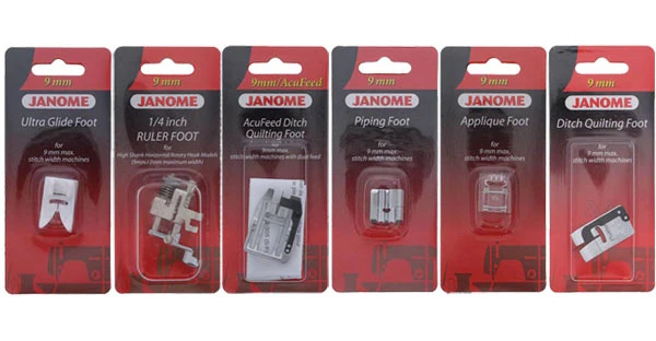 - Janome Foot Kit - Kit includes applique foot, ditch foot, piping foot, acufeed ditch foot, 1/4" Ruler Foot, Ultraglide Foot