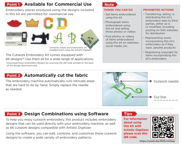 - Design combinations using software - To help you enjoy cutwork embroidery, this product includes embroidery designs that can be used directly with your embroidery machine, as well