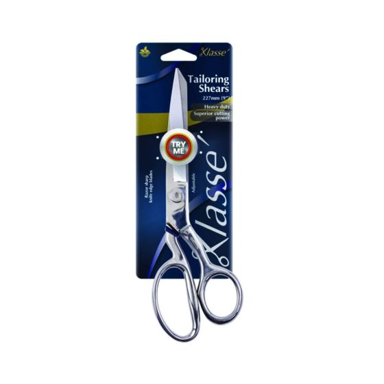 Klasse Pro 9 inch Tailoring Shears. Heavy duty full stainless steel build. Razor sharp. Cuts up to 6 layers of fabric. Increased size handle to fit 3+ adult fingers. Adjustable tension and resharpenable.