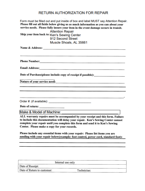 Due to the many requests of our customers who do not live near an authorized repair center, Ken's Sewing Center is now offering an online repair service. Let Ken's experienced technicians take care of your machine repairs and problems.