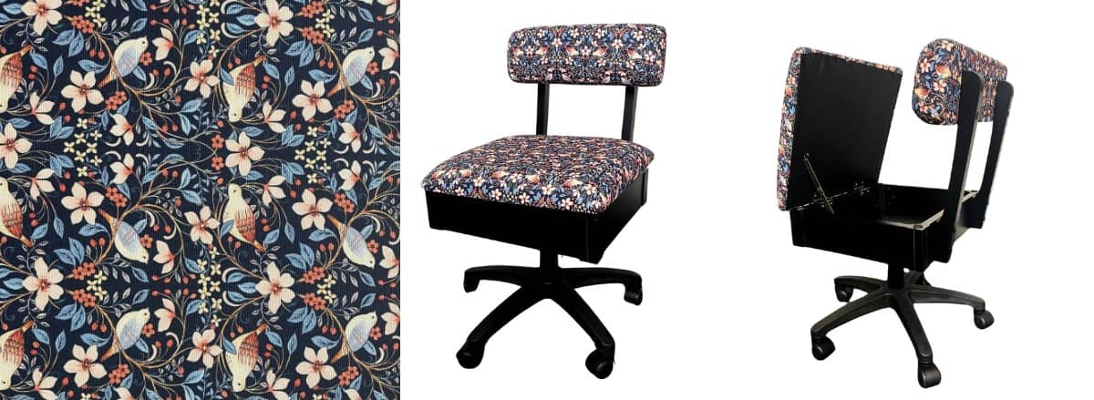 The SewFine Hydraulic Sewing Chair in Bird Floral Print seat includes a hidden compartment that serves as a convenient additional piece of storage, perfect for holding your current project pieces, threads, and notions!