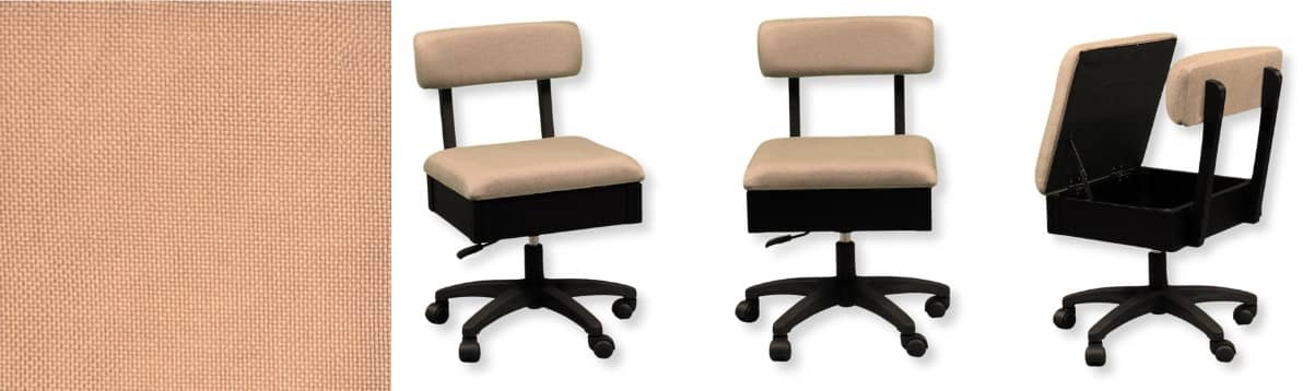Our Golden Wheat chair is a beautiful neutral shade that adds a gentle touch of color to your sewing room. The durable upholstery will stand up to years of use, with comfortable and supportive cushions. In fact, these cushions have 20% more padding than competitive models. The 360° swivel base also easily adjusts in height to between 18 to 22 inches, perfectly positioning you at the proper height while you sew. The heavy-duty casters move the chair smoothly across most flooring surfaces.