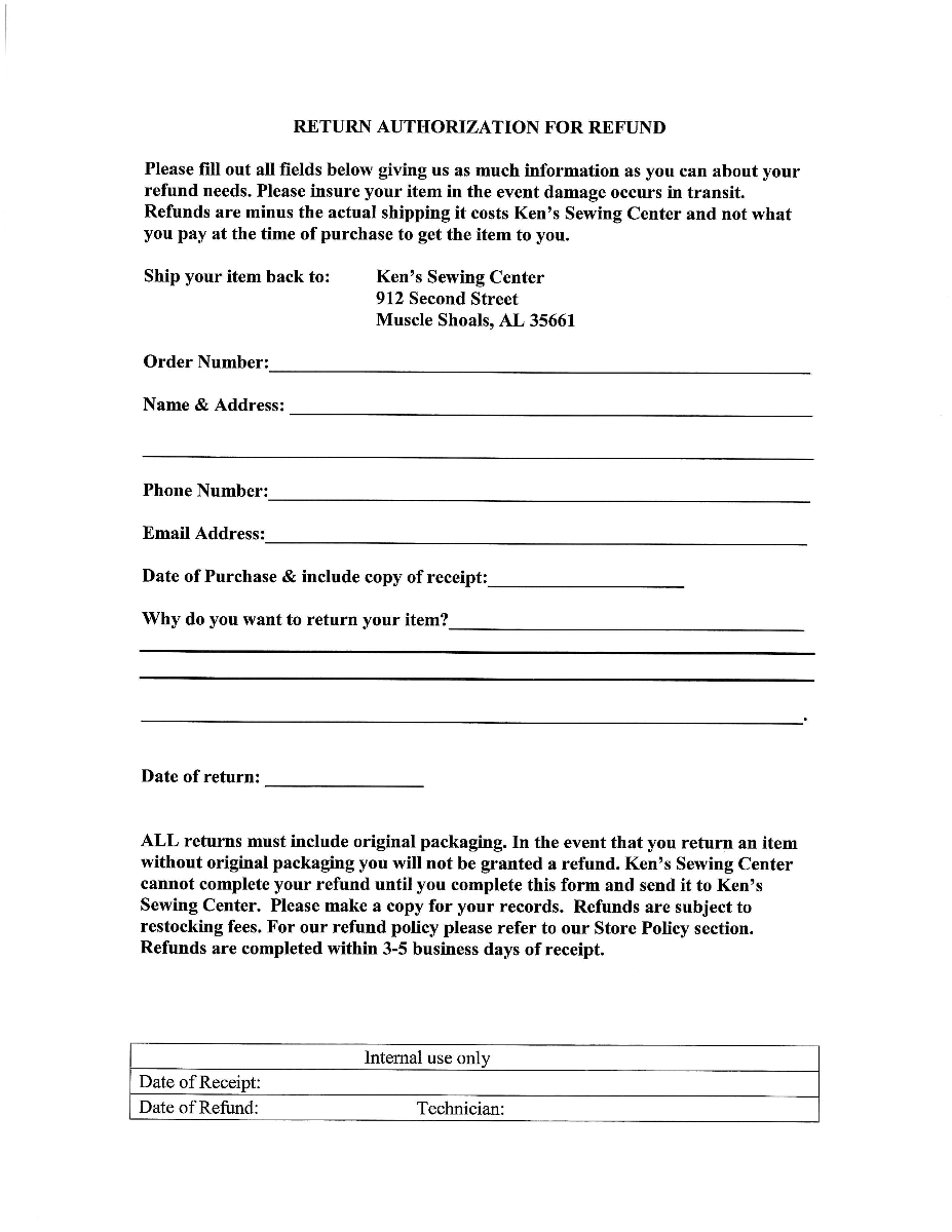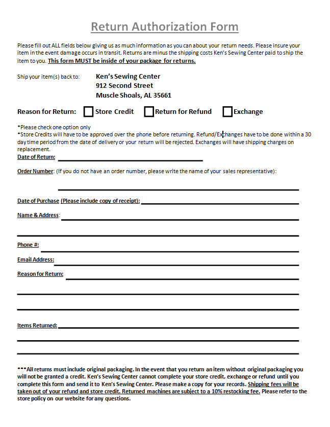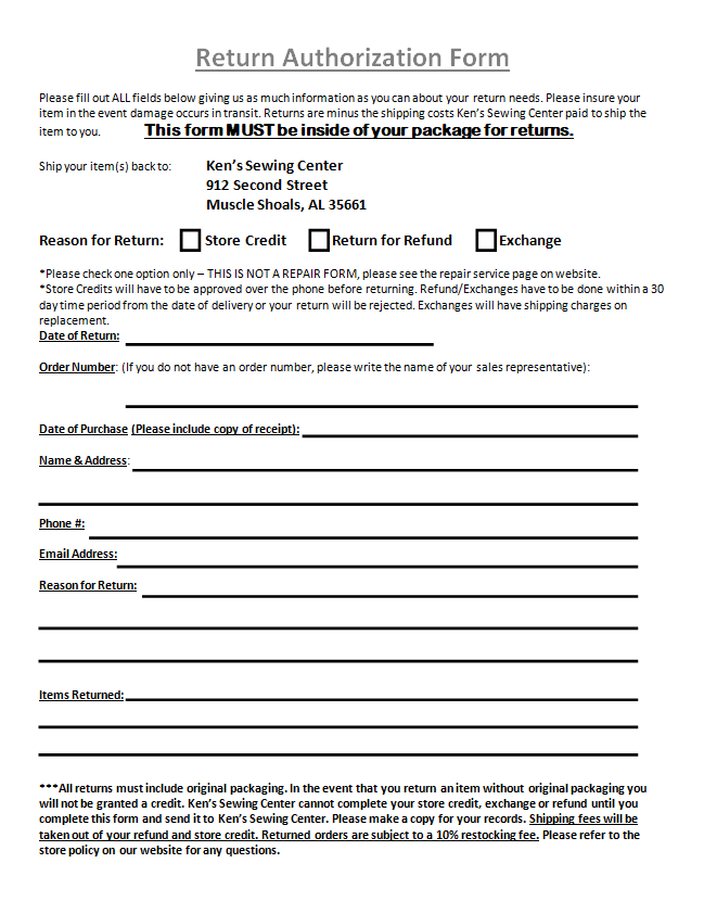 For repairs, please go to our repair services tab at the bottom of the page and print out a repair form. For returns please go to the bottom of this page and print out the return form. These have to be included in your package in order to get a refund. Your item will include warranty information. In the event you do not have any warranty information with your item (many companies are going electronic with warranty information) Ken’s Sewing Center will honor your warranty and an attempt to repair the item is the first course of action.